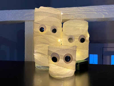 How to: tape your gauze to the jar, wrap gauze around, tape the end piece of gauze, tape the googly eyes on.